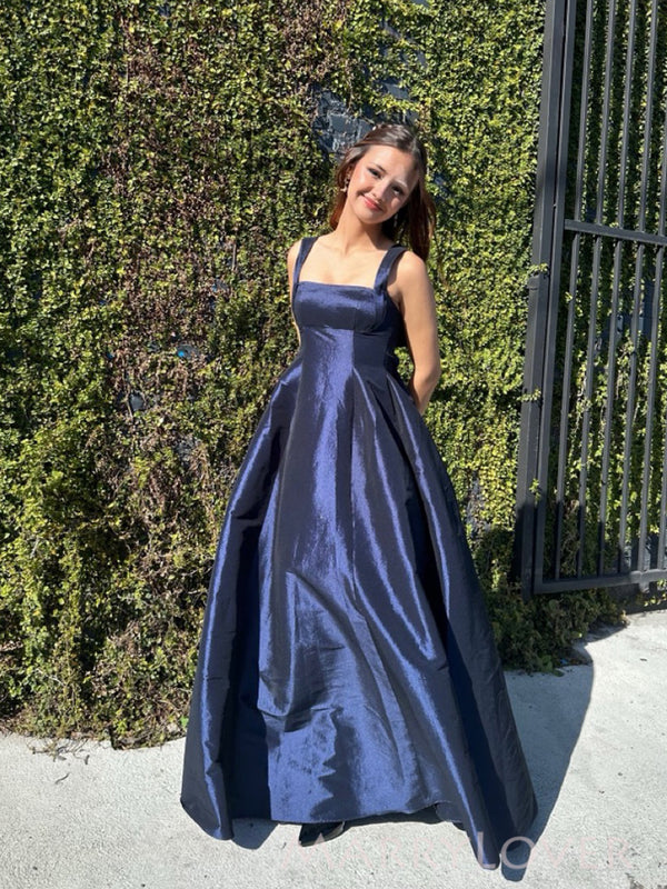 Navy Blue Satin A-line Straps Long Evening Prom Dresses, MR0032