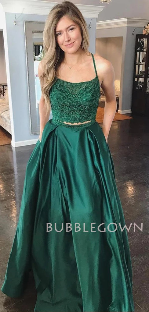 Two Pieces A-Line Green satin Cheap Evening Sweet Dresses,Long Custom