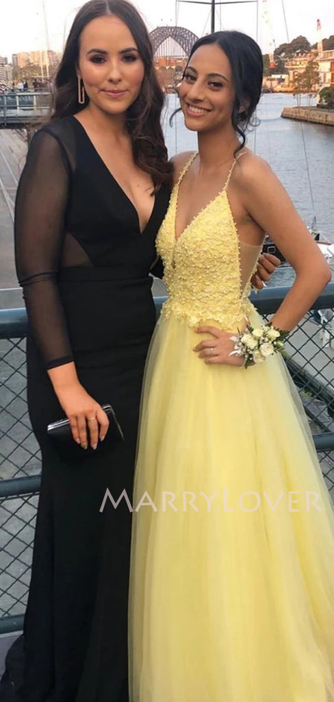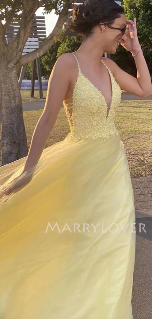 V-neck Lace Beaded A-line Yellow Long Evening Prom Dresses, MR7140 V-neck Lace Beaded A-line Yellow Long Evening Prom Dresses, MR7140