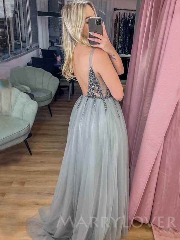 Grey Tulle See Through V-neck Beaded Long Evening Prom Dresses, Cheap Custom V-back Prom Dress, MR7805
