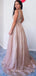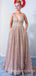 A-line Deep V-neck Champagne Gold Sequin Long Sparkly Evening Prom Dresses, Cheap Custom Prom Dresses, MR7921