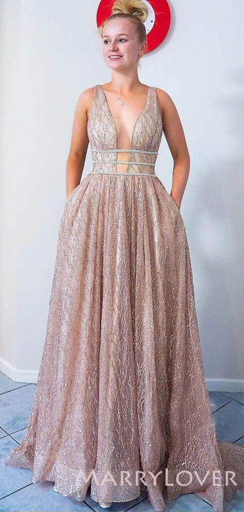 A-line Deep V-neck Champagne Gold Sequin Long Sparkly Evening Prom Dresses, Cheap Custom Prom Dresses, MR7921 A-line Deep V-neck Champagne Gold Sequin Long Sparkly Evening Prom Dresses, Cheap Custom Prom Dresses, MR7921