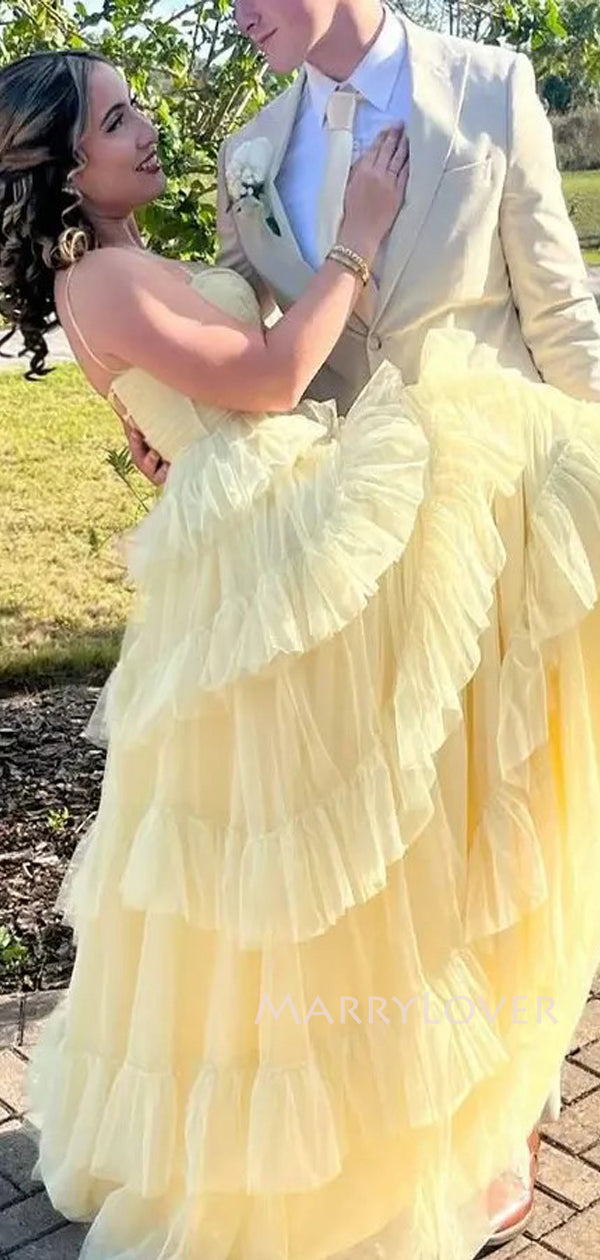 Elegant Spaghetti Straps Yellow Tulle A-line Long Evening Prom Dresses, MR9575 Elegant Spaghetti Straps Yellow Tulle A-line Long Evening Prom Dresses, MR9575