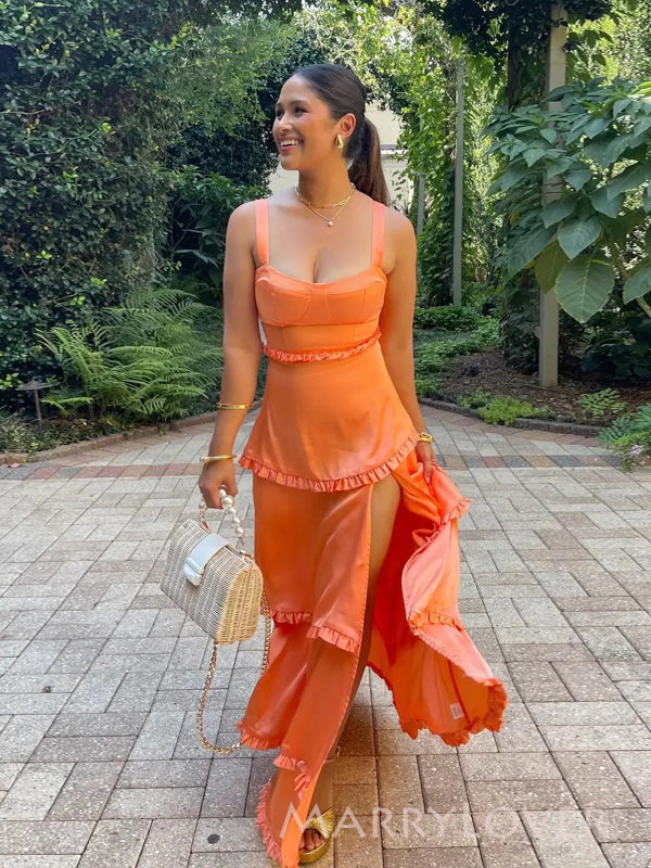 Floor-length Straps Satin Side Slit Long Evening Prom Dresses, MR9558