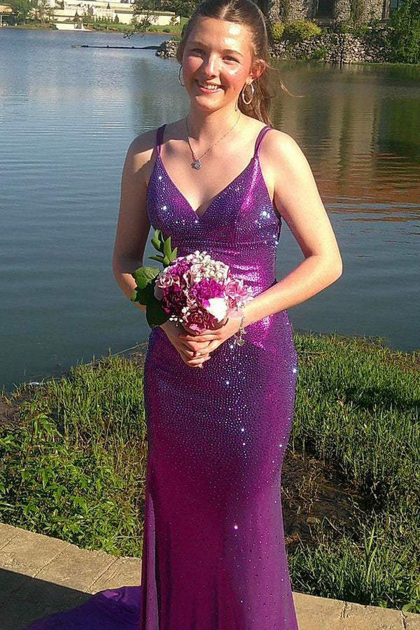 Sparkly Purple Mermiaid V-neck Long Evening Prom Dresses, Spaghetti Straps Prom Dress, MR0140 Sparkly Purple Mermiaid V-neck Long Evening Prom Dresses, Spaghetti Straps Prom Dress, MR0140