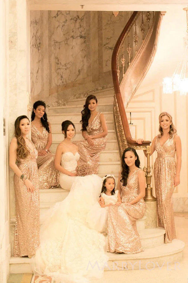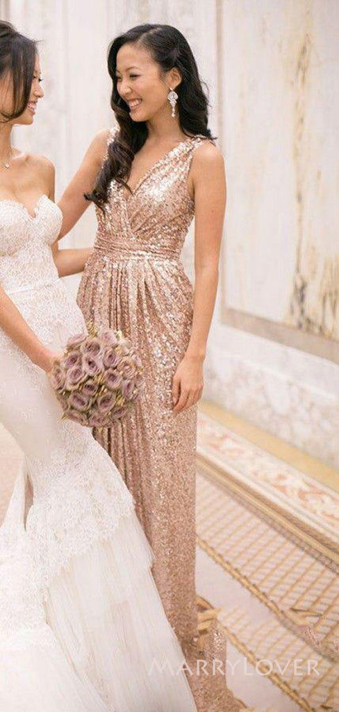 Sparkly V-neck Sequins Long Custom Bridesmaid Dresses, MRB0264