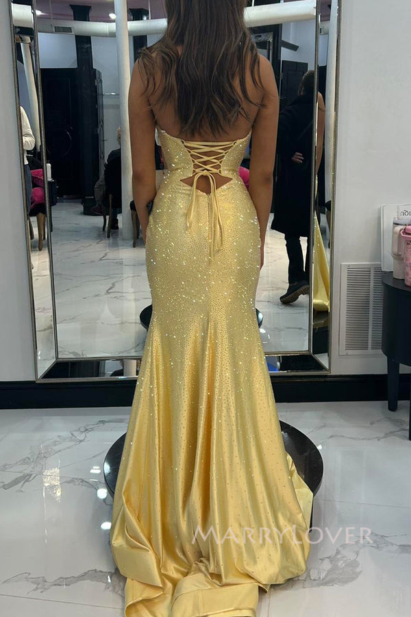 Yellow Sparkly Sweetheart Long Strapless Evening Prom Dresses, Mermaid Prom Dress, MR0085